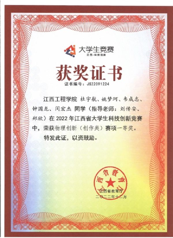 在2022年江西省大學(xué)生創(chuàng)新競賽中,我校劉傳安、鄭欣老師指導(dǎo)的學(xué)生閔宏杰、杜宇航、姚夢珂、韋成志、鐘國榮榮獲物理(創(chuàng)新類) 一等獎,并特評為優(yōu)秀指導(dǎo)老師。