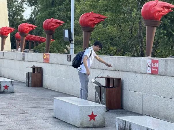 下午,當(dāng)隊(duì)員們抵達(dá)象征光明與希望的井岡山火炬廣場時(shí),莊嚴(yán)的巨型火炬雕塑在夕陽余暉中巍然矗立,散發(fā)著革命圣地的肅穆氣息。然而,細(xì)心觀察后,隊(duì)員們發(fā)現(xiàn),經(jīng)歷了一整天的游客往來,廣場地面上零星散落著些許紙屑、丟棄的礦泉水瓶蓋,火炬基座周圍的縫隙里也積了些微塵土和落葉。
