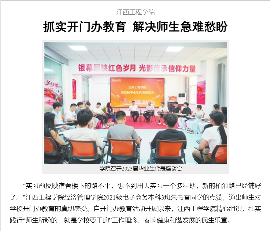 風好正是揚帆時,策馬揚鞭再奮蹄。江西工程學院以開門辦教育為抓手,將群眾路線走深走實,不僅解決一批實際問題,更凝聚推動學校發(fā)展的強大合力。新時代新征程,學校將繼續(xù)堅守為黨育人、為國育才的初心使命,厚植為民情懷,書寫新時代高等教育事業(yè)發(fā)展的民生答卷。