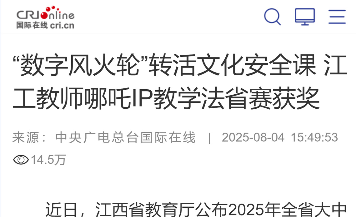 近日,江西省教育廳公布2025年全省大中小學(xué)國家安全視頻公開課評審結(jié)果,江西工程學(xué)院馬克思主義學(xué)院教師蘭洋洋憑借作品《哪吒的風(fēng)火輪:數(shù)字時(shí)代的文化安全保衛(wèi)戰(zhàn)》,在本科組競賽中斬獲三等獎(jiǎng),其將傳統(tǒng)神話IP與現(xiàn)代國家安全觀相結(jié)合的創(chuàng)新教學(xué)設(shè)計(jì)獲專家肯定。
