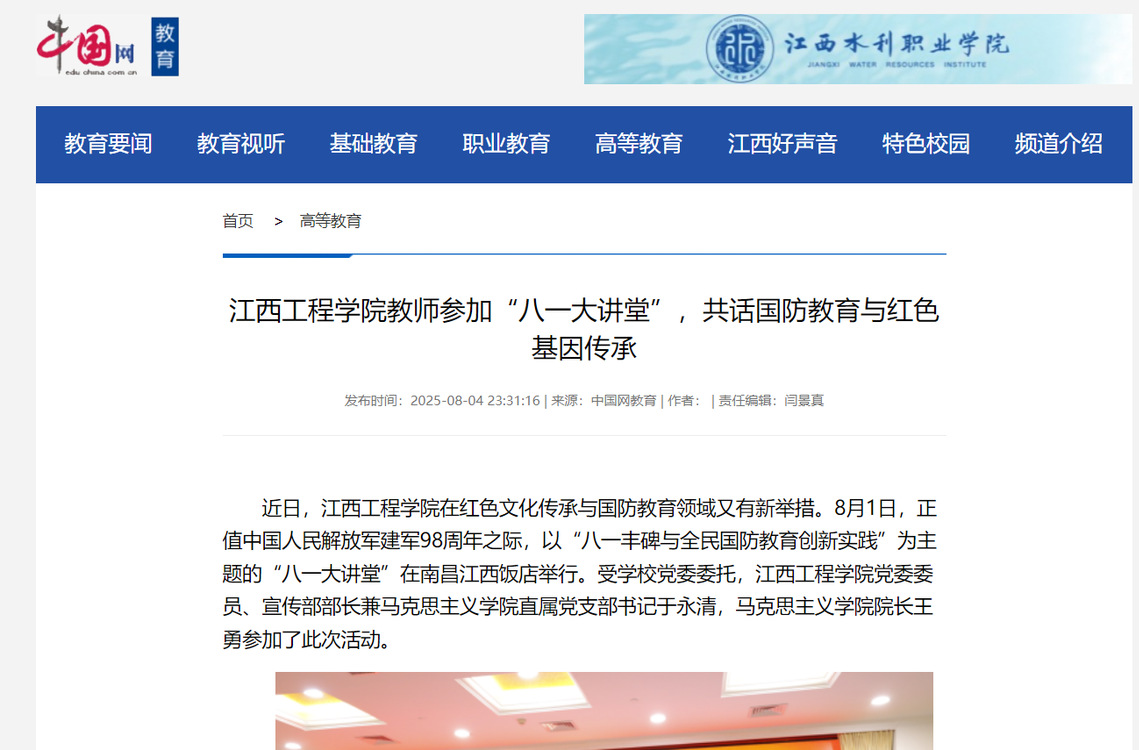 近日,江西工程學(xué)院在紅色文化傳承與國(guó)防教育領(lǐng)域又有新舉措。8月1日,正值中國(guó)人民解放軍建軍98周年之際,以“八一豐碑與全民國(guó)防教育創(chuàng)新實(shí)踐”為主題的“八一大講堂”在南昌江西飯店舉行。受學(xué)校黨委委托,江西工程學(xué)院黨委委員、宣傳部部長(zhǎng)兼馬克思主義學(xué)院直屬黨支部書(shū)記于永清,馬克思主義學(xué)院院長(zhǎng)王勇參加了此次活動(dòng)。