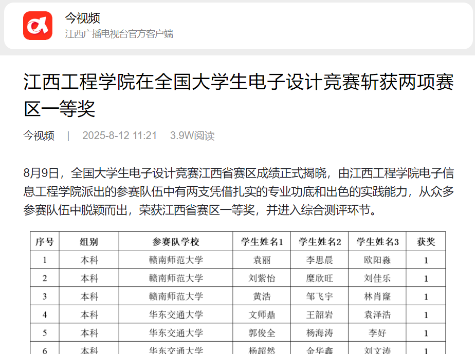 8月9日,全國(guó)大學(xué)生電子設(shè)計(jì)競(jìng)賽江西省賽區(qū)成績(jī)正式揭曉,由江西工程學(xué)院電子信息工程學(xué)院派出的參賽隊(duì)伍中有兩支憑借扎實(shí)的專(zhuān)業(yè)功底和出色的實(shí)踐能力,從眾多參賽隊(duì)伍中脫穎而出,榮獲江西省賽區(qū)一等獎(jiǎng),并進(jìn)入綜合測(cè)評(píng)環(huán)節(jié)。