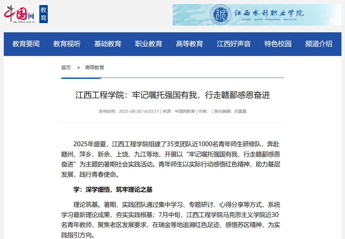 2025年盛夏,江西工程學(xué)院組建了35支團隊近1000名青年師生研修隊,奔赴贛州、萍鄉(xiāng)、新余、上饒、九江等地,開展以“牢記囑托強國有我,行走贛鄱感恩奮進”為主題的暑期社會實踐活動。青年師生以實際行動感悟紅色精神,助力基層發(fā)展,踐行青春使命。