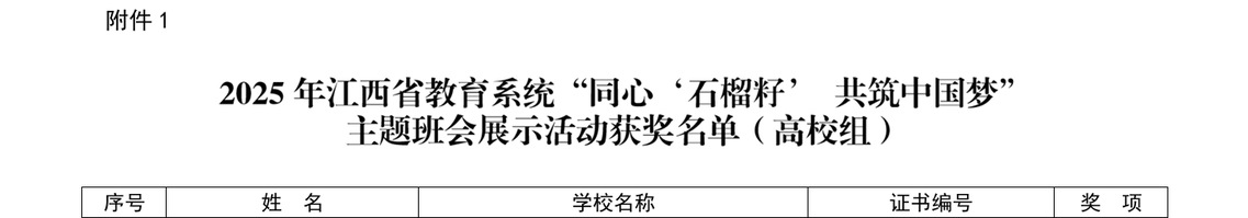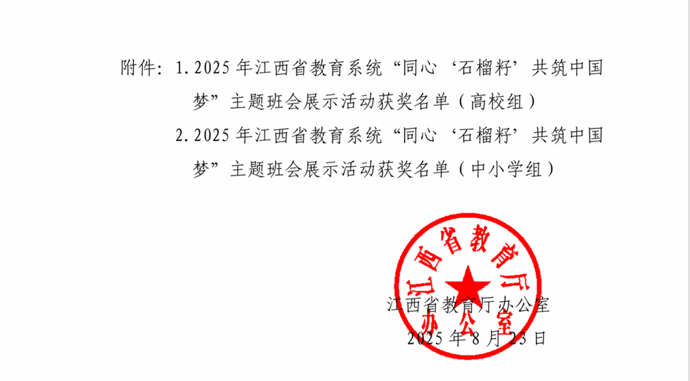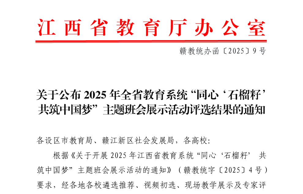 近日,江西省教育廳公布了《關(guān)于公布2025年全省教育系統(tǒng)“同心‘石榴籽’共筑中國夢”主題班會展示活動評選結(jié)果的通知》。江西工程學(xué)院教育與健康管理學(xué)院高爽老師榮獲2025年全省教育系統(tǒng)“同心‘石榴籽’共筑中國夢”主題班會展示活動三等獎。
