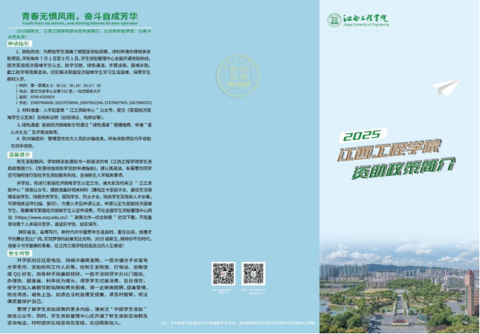政策宣傳前置,讓資助信息“飛入尋常百姓家”。今年暑期,學(xué)生資助管理中心創(chuàng)新工作方式,將資助政策宣傳關(guān)口前移。中心精心編印《2025年江西工程學(xué)院資助政策簡(jiǎn)介》,隨錄取通知書一并寄送到每位新生手中。這本小冊(cè)子全面介紹了國(guó)家獎(jiǎng)學(xué)金、國(guó)家勵(lì)志獎(jiǎng)學(xué)金、國(guó)家助學(xué)金、國(guó)家助學(xué)貸款、勤工助學(xué)、學(xué)費(fèi)減免等多種資助形式,用通俗易懂的語言和流程圖解,讓學(xué)生和家長(zhǎng)對(duì)高校資助政策有了全面了解。