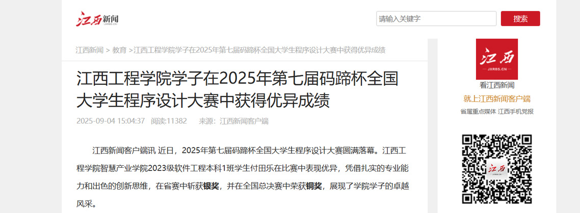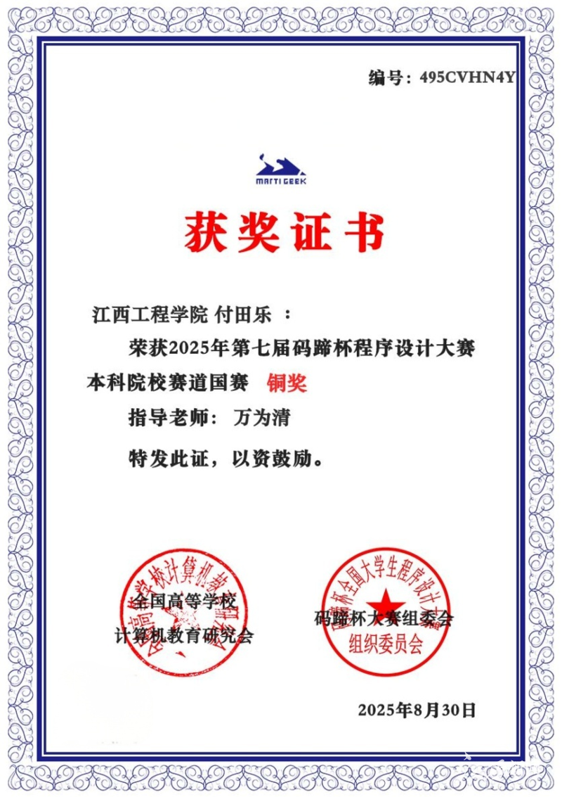 江西新聞客戶端訊近日,2025年第七屆碼蹄杯全國大學生程序設計大賽圓滿落幕。江西工程學院智慧產(chǎn)業(yè)學院2023級軟件工程本科1班學生付田樂在比賽中表現(xiàn)優(yōu)異,憑借扎實的專業(yè)能力和出色的創(chuàng)新思維,在省賽中斬獲銀獎,并在全國總決賽中榮獲銅獎,展現(xiàn)了學院學子的卓越風采。