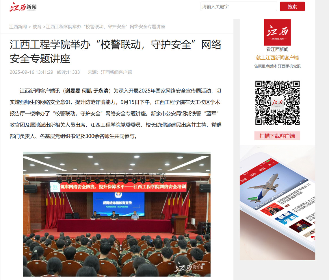 江西新聞客戶端訊(謝旻旻 何凱 于永清)為深入開展2025年國家網(wǎng)絡(luò)安全宣傳周活動,切實(shí)增強(qiáng)師生的網(wǎng)絡(luò)安全意識,提升防范詐騙能力,9月15日下午,江西工程學(xué)院在天工校區(qū)學(xué)術(shù)報告廳一樓舉辦了“校警聯(lián)動,守護(hù)安全”網(wǎng)絡(luò)安全專題講座。新余市公安局鋼城鐵警“藍(lán)軍”教官團(tuán)及屬地派出所相關(guān)人員出席,江西工程學(xué)院黨委委員、校長助理鄒建民出席并主持,黨群部門負(fù)責(zé)人、各基層黨組織書記及300余名師生共同參與。
