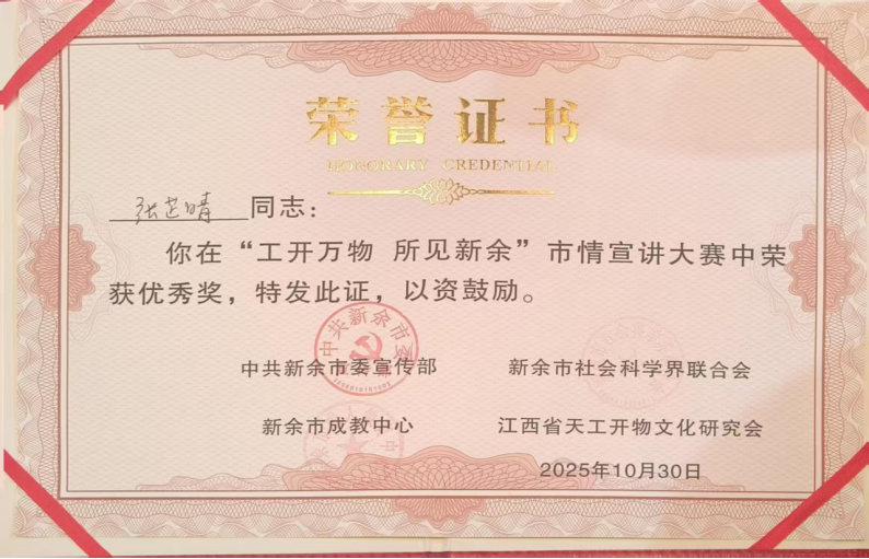 2025年10月下旬,由市委宣傳部、市社科聯(lián)、市成教中心、江西省天工開物文化研究會聯(lián)合主辦的“工開萬物 所見新余”市情宣講大賽經(jīng)過一天角逐圓滿收官。此次市情宣講大賽以“天工開物 所見新余”為主題,旨在挖掘新余歷史文化底蘊、展現(xiàn)城市發(fā)展活力,鼓勵青年學子走進家鄉(xiāng)、了解市情,用青春之聲講述城市故事。經(jīng)濟管理學院學子張芷晴憑借扎實的知識儲備、生動的表達能力與深刻的市情理解,在眾多參賽選手中脫穎而出,榮獲大賽優(yōu)秀獎,為學院爭光添彩!