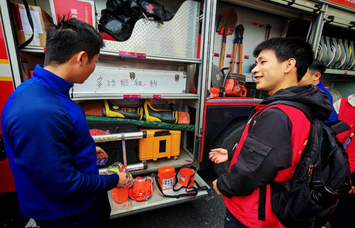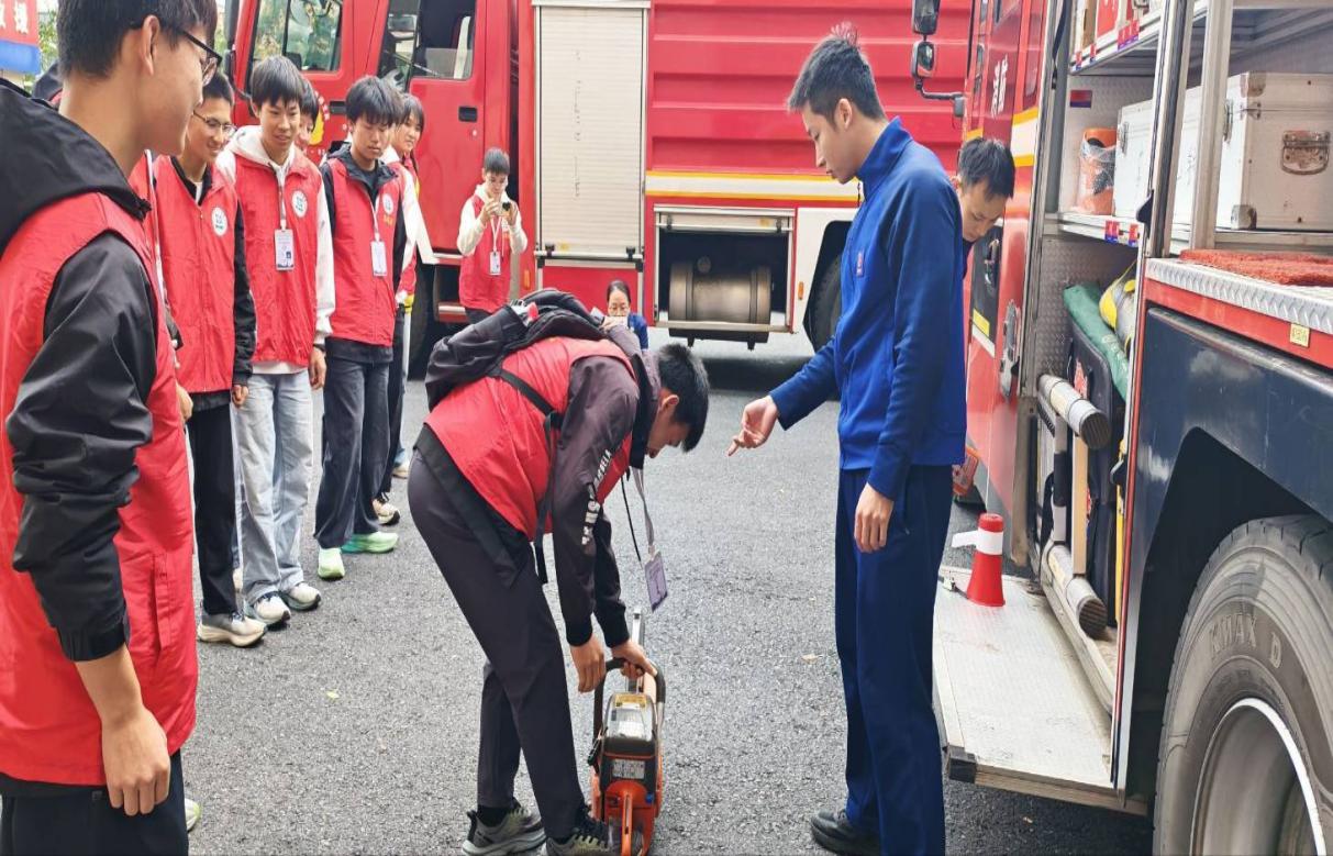 活動伊始,消防員們對志愿者們的到來表示熱烈歡迎。在消防員的帶領(lǐng)下,同學(xué)們首先參觀了消防車輛和各類隨車器材裝備。面對功能各異、種類繁多的消防設(shè)備,志愿者們充滿了好奇。消防員耐心細致地講解了各種車輛、器材的名稱、用途和使用方法,并現(xiàn)場演示了液壓擴張器、無齒鋸、空氣呼吸器等專業(yè)救援工具的操作。部分同學(xué)在消防員的指導(dǎo)和保護下,親身體驗了穿戴滅火防護服和消防頭盔,切實感受到了消防員在滅火救援工作中的辛苦與不易。