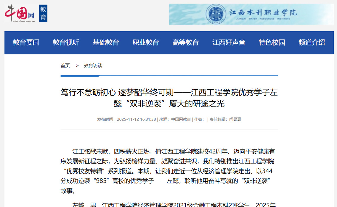 江工弦歌未歇,四秩薪火正燃。值江西工程學(xué)院建校42周年、邁向平安健康有序發(fā)展新征程之際,為弘揚(yáng)榜樣力量、凝聚奮進(jìn)共識(shí),我們特別推出江西工程學(xué)院“優(yōu)秀校友特輯”系列報(bào)道。本期,讓我們走近一位從經(jīng)濟(jì)管理學(xué)院走出、以344分成功逆襲“985”高校的優(yōu)秀學(xué)子——左懿,聆聽(tīng)他用奮斗寫(xiě)就的“雙非逆襲”故事。