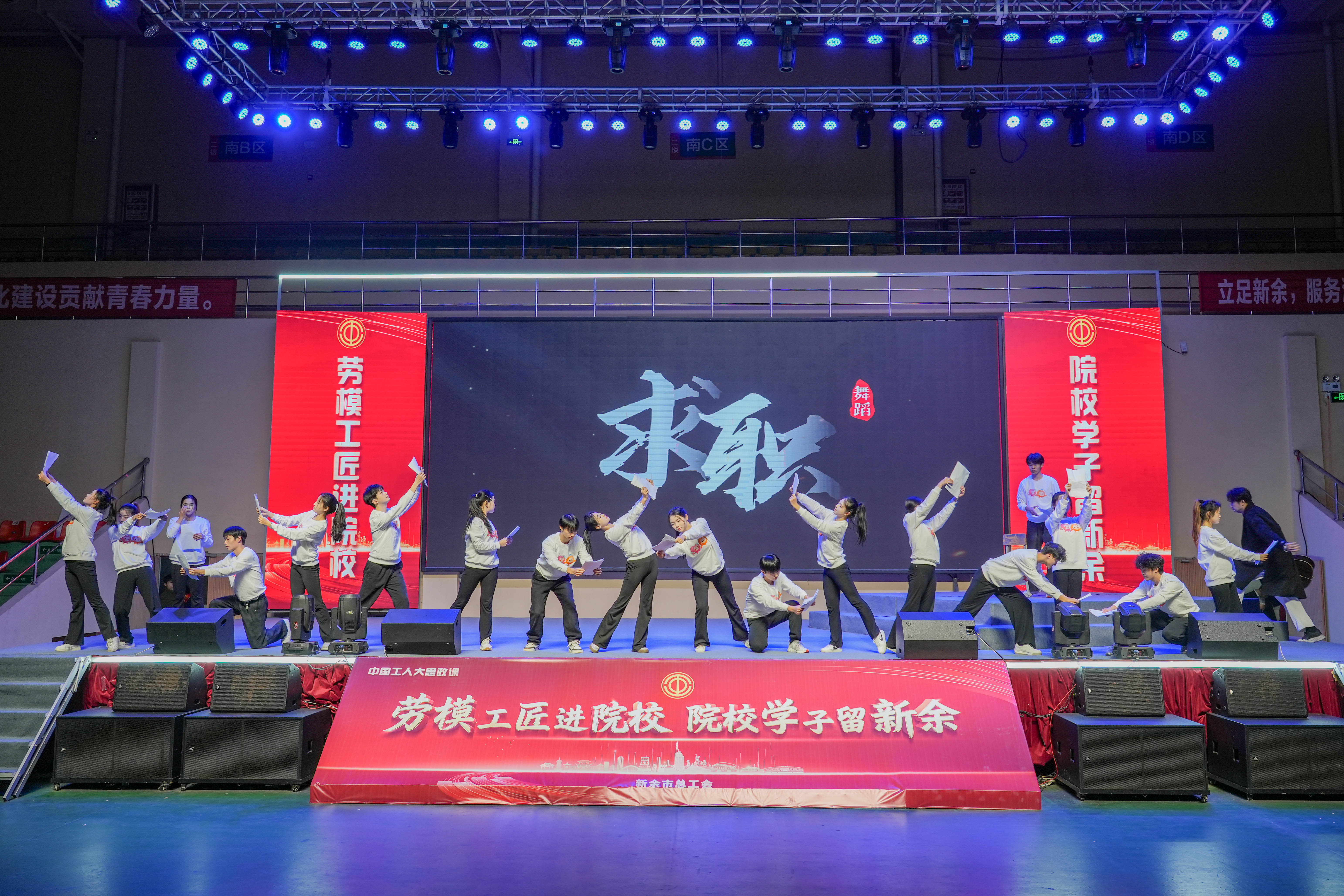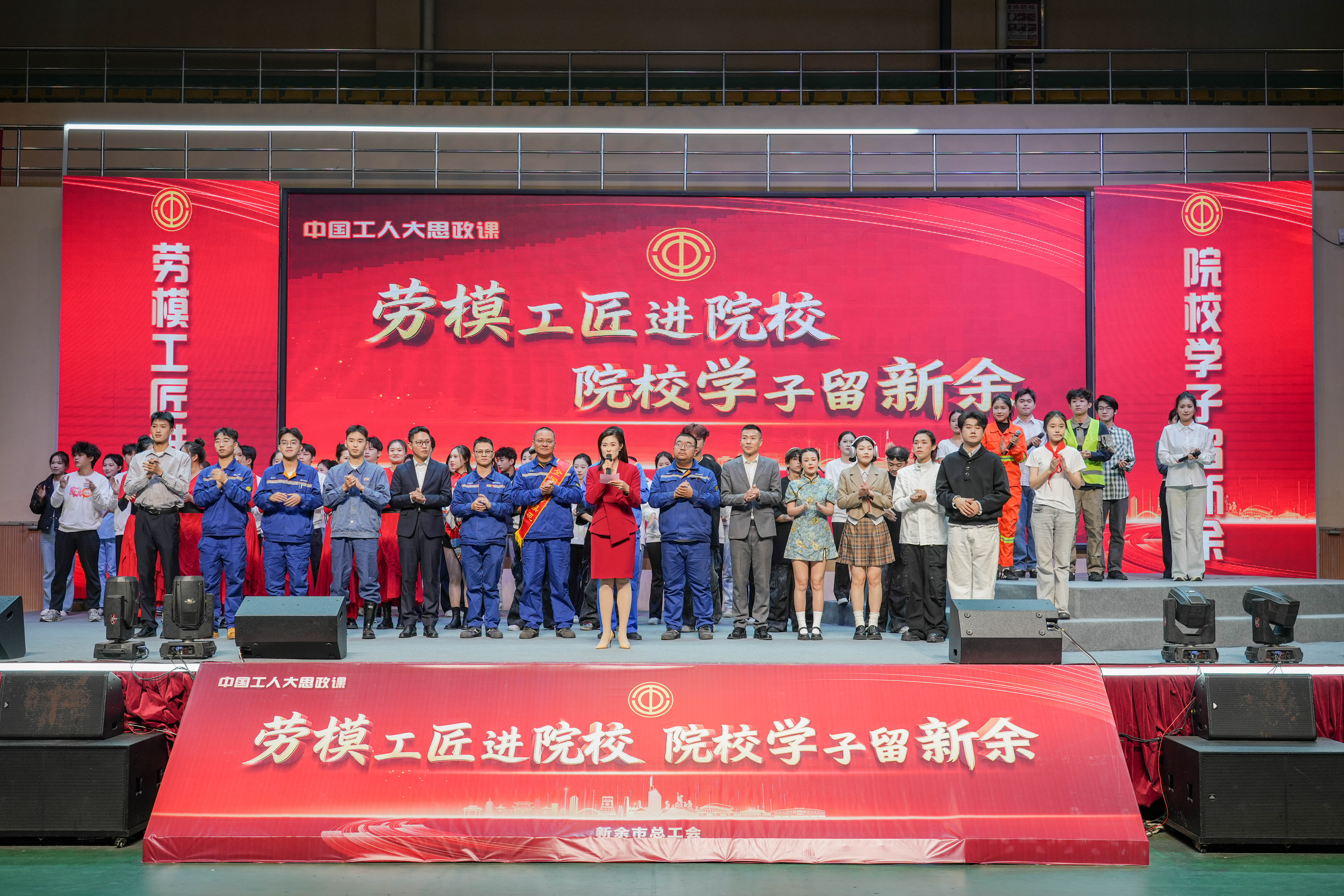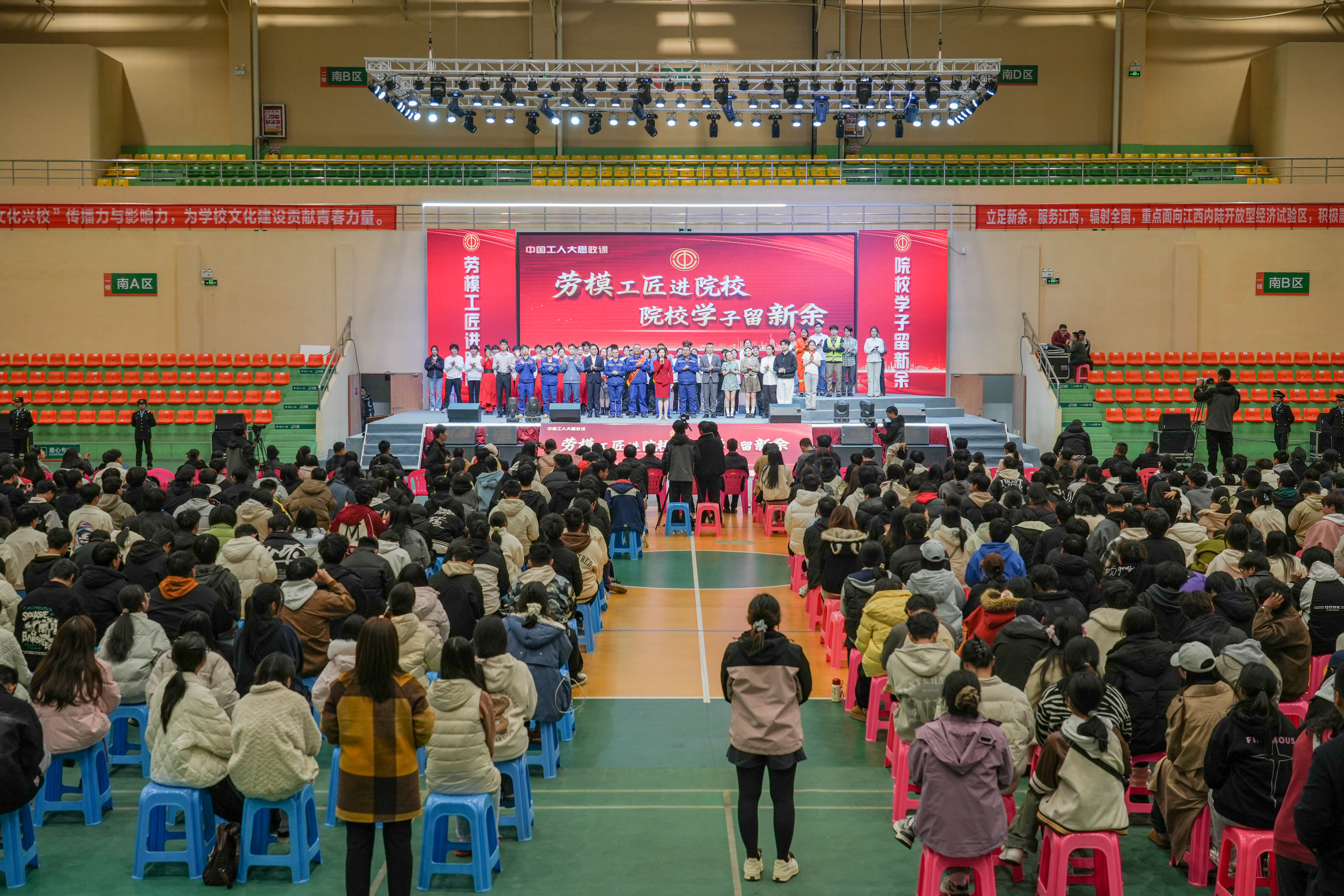11月27日晚,一堂以“勞模工匠進(jìn)院校 院校學(xué)子留新余”為主題“大思政課”在學(xué)校體育館盛大舉行。校黨委書記、督導(dǎo)專員魏建克,新余市總工會(huì)黨組書記、常務(wù)副主席胡春華,校黨委委員、理事長(zhǎng)助理、校長(zhǎng)助理樂(lè)俊杰,馬克思主義學(xué)直屬黨支部書記于永清、馬克思主義學(xué)院院長(zhǎng)王勇、工會(huì)主席劉志英等領(lǐng)導(dǎo)出席活動(dòng)。勞模代表及院校師生近1000人共同參與了這場(chǎng)思政盛宴。