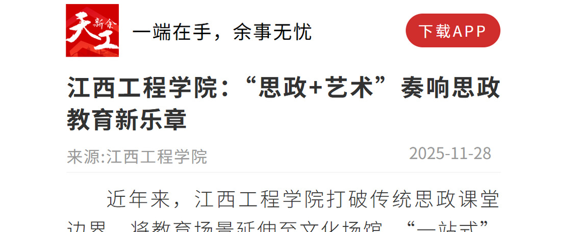 “思政+藝術(shù)”構(gòu)建育人新格局。江西工程學(xué)院通過天工文化藝術(shù)浸潤、勞模精神藝術(shù)化傳播、傳統(tǒng)節(jié)日賦能等多元實(shí)踐,讓“思政+藝術(shù)”融合育人模式落地生根。這種模式打破了思政教育與藝術(shù)教育的壁壘,將價值引領(lǐng)融入藝術(shù)體驗(yàn),讓學(xué)生在沉浸式、互動式參與中,實(shí)現(xiàn)思想覺悟與藝術(shù)素養(yǎng)的同步提升。新征程新目標(biāo),學(xué)校將繼續(xù)深化“思政+”育人改革,為培養(yǎng)德智體美勞全面發(fā)展的社會主義建設(shè)者和接班人貢獻(xiàn)學(xué)校力量。