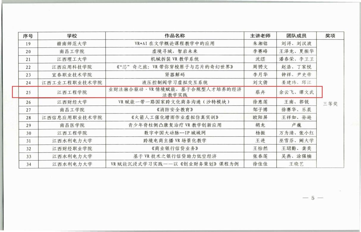 近日,根據(jù)江西省教育廳、省工業(yè)和信息化廳與南昌市人民政府聯(lián)合下發(fā)的《關(guān)于公布2025年江西省虛擬現(xiàn)實(shí)教學(xué)應(yīng)用創(chuàng)新大賽獲獎(jiǎng)名單的通知》,學(xué)校蔡卉老師主講的經(jīng)濟(jì)法教學(xué)團(tuán)隊(duì),參賽作品“業(yè)財(cái)法融合驅(qū)動(dòng)·VR情境賦能——基于合規(guī)型人才培養(yǎng)的經(jīng)濟(jì)法教學(xué)實(shí)踐”,榮獲江西省虛擬現(xiàn)實(shí)教學(xué)應(yīng)用創(chuàng)新大賽教學(xué)應(yīng)用賽道三等獎(jiǎng),為我校教學(xué)創(chuàng)新競(jìng)賽又添新篇章。