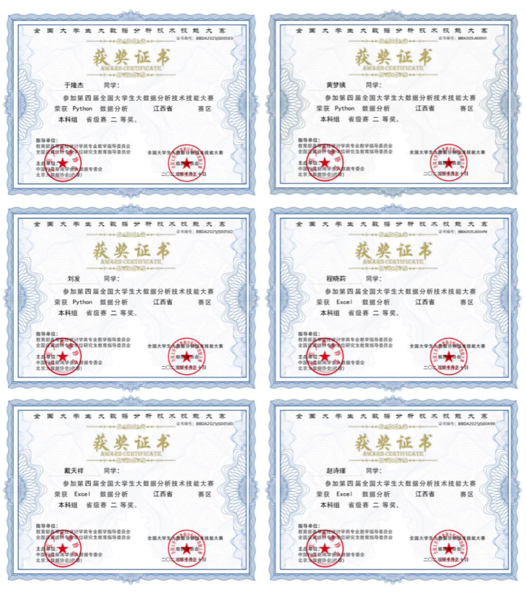 據(jù)悉,全國大學生大數(shù)據(jù)分析技術(shù)技能大賽是國內(nèi)大數(shù)據(jù)分析領(lǐng)域的權(quán)威賽事,也是教育部認可的84項學科競賽之一,大賽旨在檢驗和提升學生的大數(shù)據(jù)分析與應(yīng)用能力。此次比賽中,在何璠、鄧亮老師的悉心指導(dǎo)下,于隆杰、劉發(fā)、戴天祥、黃夢姨、趙詩瑾、程曉莉六位參賽學生積極備賽,在數(shù)據(jù)清洗、建模分析、可視化呈現(xiàn)等多個環(huán)節(jié)展現(xiàn)出過硬的專業(yè)素養(yǎng),均獲得省級二等獎。