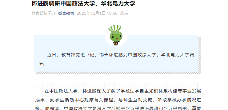 近日,教育部黨組書記、部長懷進鵬到中國政法大學、華北電力大學調(diào)研。