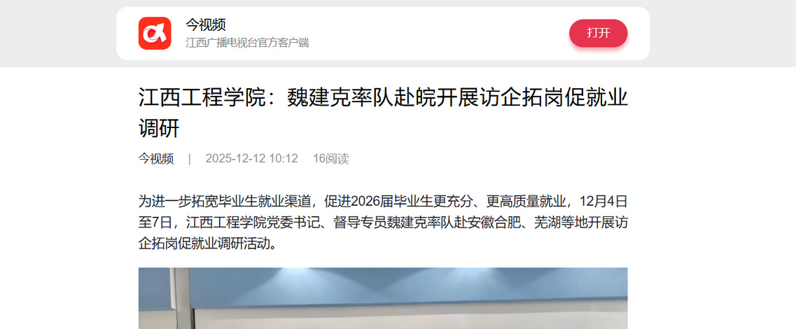 為進(jìn)一步拓寬畢業(yè)生就業(yè)渠道,促進(jìn)2026屆畢業(yè)生更充分、更高質(zhì)量就業(yè),12月4日至7日,江西工程學(xué)院黨委書記、督導(dǎo)專員魏建克率隊(duì)赴安徽合肥、蕪湖等地開展訪企拓崗促就業(yè)調(diào)研活動(dòng)。