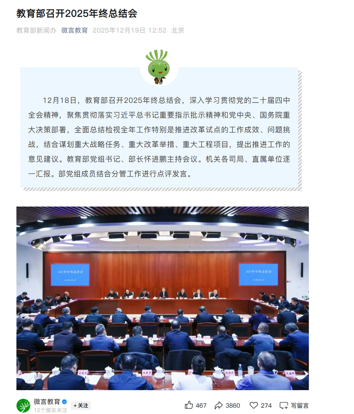 12月18日,教育部召開2025年終總結(jié)會,深入學習貫徹黨的二十屆四中全會精神,聚焦貫徹落實習近平總書記重要指示批示精神和黨中央、國務(wù)院重大決策部署,全面總結(jié)檢視全年工作特別是推進改革試點的工作成效、問題挑戰(zhàn),結(jié)合謀劃重大戰(zhàn)略任務(wù)、重大改革舉措、重大工程項目,提出推進工作的意見建議。教育部黨組書記、部長懷進鵬主持會議。機關(guān)各司局、直屬單位逐一匯報。部黨組成員結(jié)合分管工作進行點評發(fā)言。