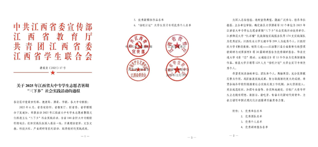 近日,我校在中共江西省委宣傳部、江西省教育廳、共青團(tuán)江西省委、江西省學(xué)生聯(lián)合會(huì)聯(lián)合開展2025年江西省大中專學(xué)生志愿者暑期“三下鄉(xiāng)”社會(huì)實(shí)踐表彰評(píng)選中喜獲佳績,多個(gè)個(gè)人與團(tuán)隊(duì)獲得表彰,充分展現(xiàn)出學(xué)校實(shí)踐育人工作的扎實(shí)成效與青春風(fēng)采。