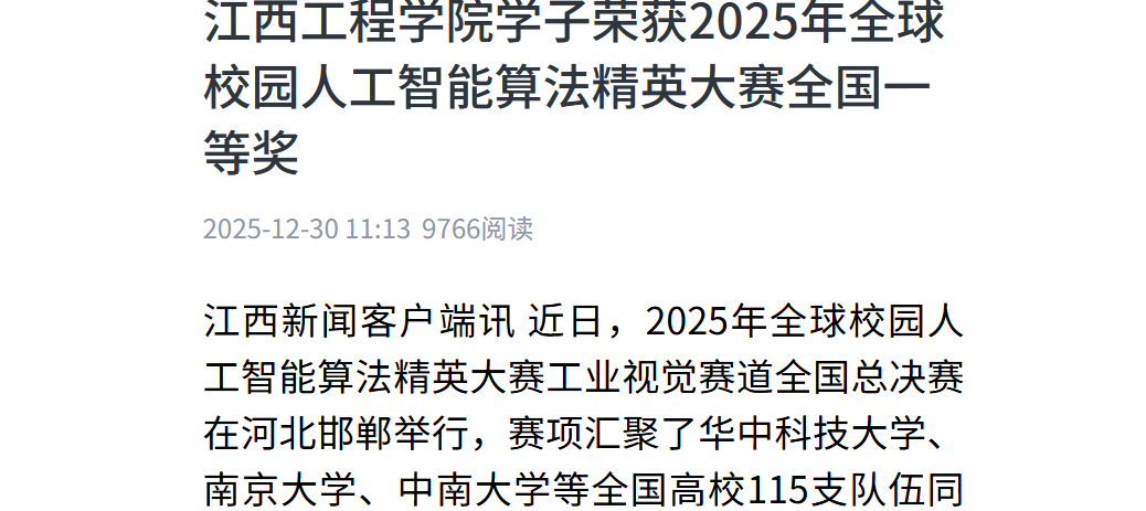 江西新聞客戶端訊 近日,2025年全球校園人工智能算法精英大賽工業(yè)視覺賽道全國總決賽在河北邯鄲舉行,賽項(xiàng)匯聚了華中科技大學(xué)、南京大學(xué)、中南大學(xué)等全國高校115支隊(duì)伍同臺(tái)競技。江西工程學(xué)院人工智能與數(shù)據(jù)科學(xué)學(xué)院機(jī)器人工程專業(yè)的三支學(xué)生隊(duì)伍,憑借專業(yè)功底、穩(wěn)定的臨場發(fā)揮與創(chuàng)新性的技術(shù)方案,一舉斬獲全國一等獎(jiǎng)2項(xiàng)(位列該賽道全國第一名),全國二等獎(jiǎng)1項(xiàng)。
