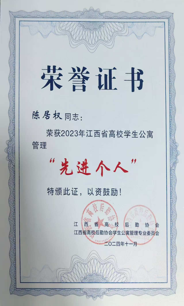 2025年,學(xué)?!耙徽臼健睂W(xué)生社區(qū)建設(shè)工作持續(xù)深耕、碩果盈枝。2025年12月,江西省高校學(xué)生公寓管理專業(yè)委員會(huì)2025年年會(huì)暨學(xué)生公寓管理規(guī)范化建設(shè)推進(jìn)會(huì)在贛州召開,學(xué)校連續(xù)獲評(píng)2023、2024年度江西省高校學(xué)生公寓管理“先進(jìn)單位”稱號(hào),陳居權(quán)、朱鵬飛等同志獲評(píng)“先進(jìn)個(gè)人”。省級(jí)榮譽(yù)的連續(xù)獲得,不僅是對(duì)學(xué)?!耙徽臼健睂W(xué)生社區(qū)管理服務(wù)工作的高度認(rèn)可,更印證了學(xué)校“一站式”學(xué)生社區(qū)育人工作的深厚成效。