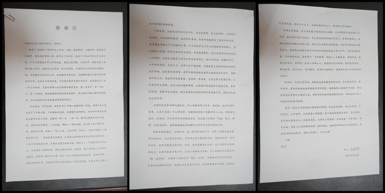在感謝信中,江會(huì)權(quán)深情回顧了自2011年踏入母校以來的成長歷程,十余載春秋,從懵懂青澀的新生到即將扎根基層的公安工作者,母校的一草一木、辦學(xué)理念與人文底蘊(yùn)早已融入其血脈。他表示,這份政審合格的結(jié)果,凝聚著母校十余載的育人心血,承載著恩師們的深情關(guān)懷,既是對自己多年堅(jiān)守與努力的肯定,更是母校育人初心的生動(dòng)體現(xiàn)。